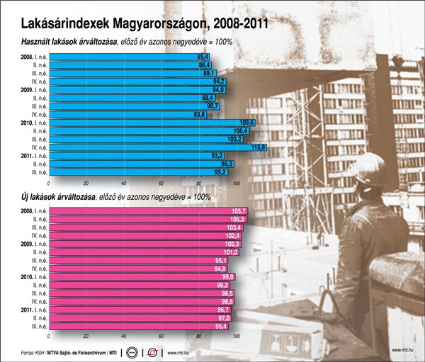Használt lakások árváltozása; új lakások árváltozása; előző év azonos negyedéve = 100%